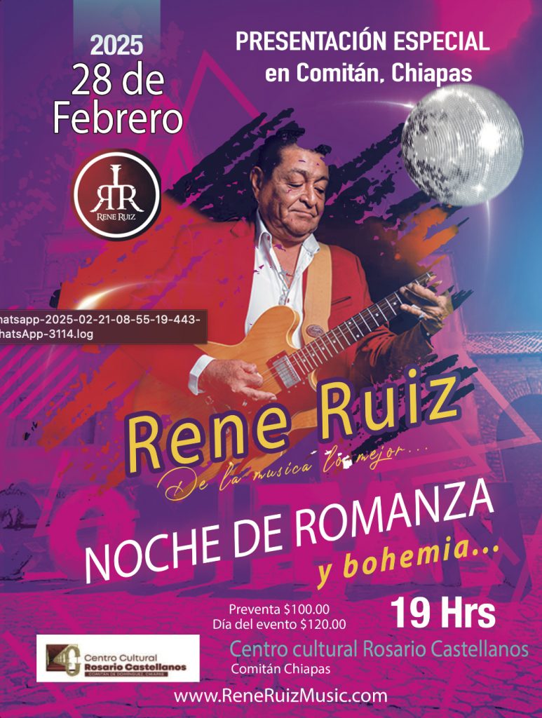 Con Rene Ruiz, presentando su show musical interpretando musica de su obra musical, así como las tan solicitas de dominio popular, noche para disfrutar de una excelente voz Comitán Chiapas, solicita tus boletos y acompáñanos a esta velada romántica musical con este gran talento en la voz de Rene y sus composiciones.